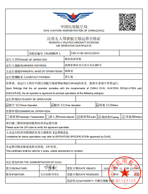 为抢抓低空经济发展机遇,拓宽学子就业赛道,强化专业建设与产业需求的衔接,近日,西安欧亚学院成功取得中国民用航空局(CAAC)颁发的民用无人驾驶航空器运营合格证。这一权威认证标志着学校在低空经济领域的教学实力、安全管理体系获得官方认可,为独立自主合规开展 CAAC 无人机技能培训奠定坚实基础,也为学子解锁多元就业新可能提供有力支撑。