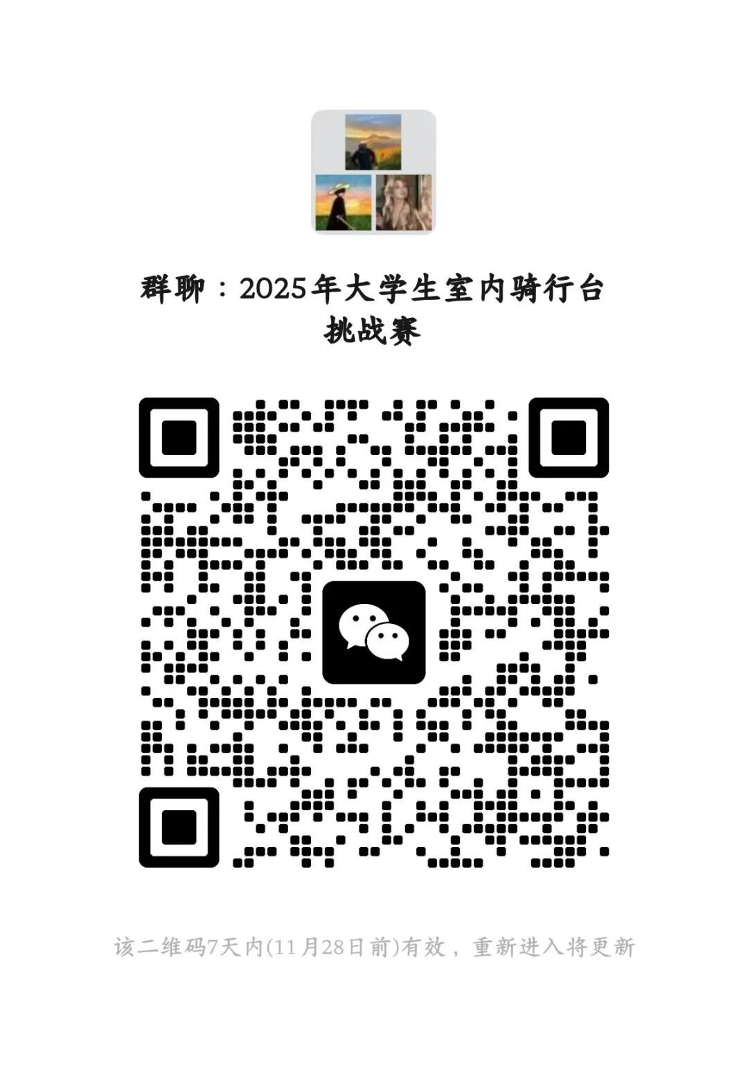 扫描下方二维码,加入 “2025 年大学生室内骑行台挑战赛” 官方咨询群,获取报名链接及赛事最新通知(群有效期至 12 月 5 日,逾期请联系工作人员)。
