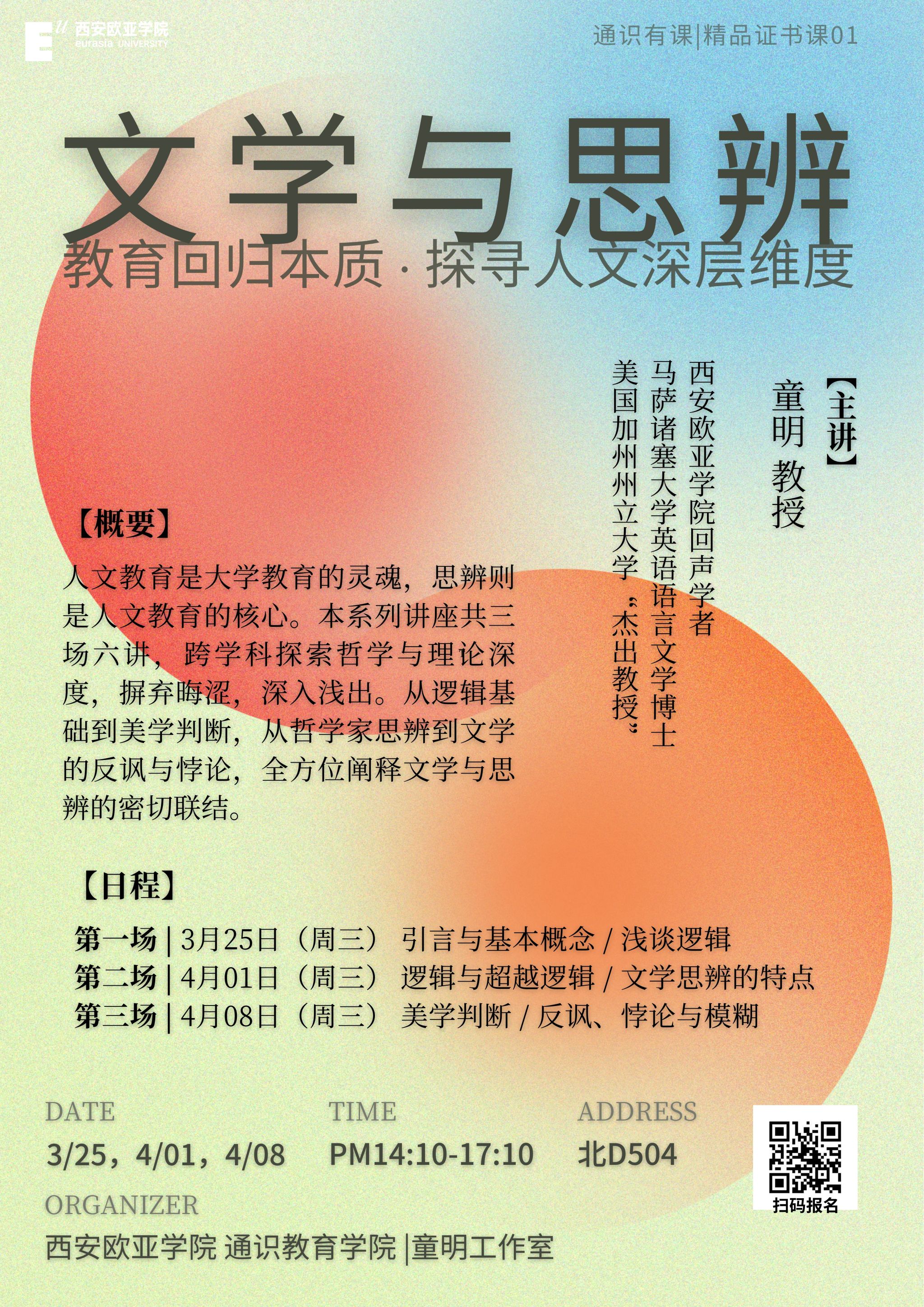 人文教育是大学教育的灵魂,思辨则是人文教育的核心。本系列讲座共三场六讲,跨学科深度探索,摒弃晦涩,深入浅出。从逻辑基础到美学判断,从哲学家思辨到文学的反讽与悖论,全方位阐释文学与思辨的密切联结。